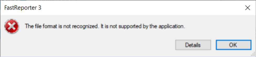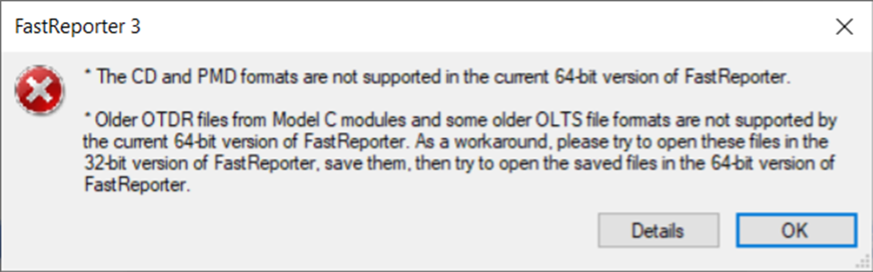 If you use the 64-bit version of FastReporter and you are unsure if the file format is supported, you can try to open the file in the 32-bit version. Both versions of FastReporter 3 can be installed and run simultaneously on the same computer.