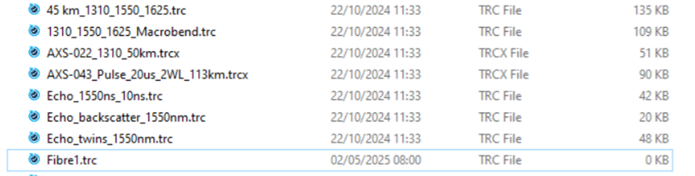 The size of the file can give us a clue as to whether it could be corrupted or not. In the example below we can see that proper trace files vary in size (depending on number wavelengths, events etc.) but all the files are at least a few KB in size except for one which has been corrupted:
